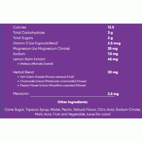 Made with Melatonin, Lemon Balm, Magnesium and Vitamin D.