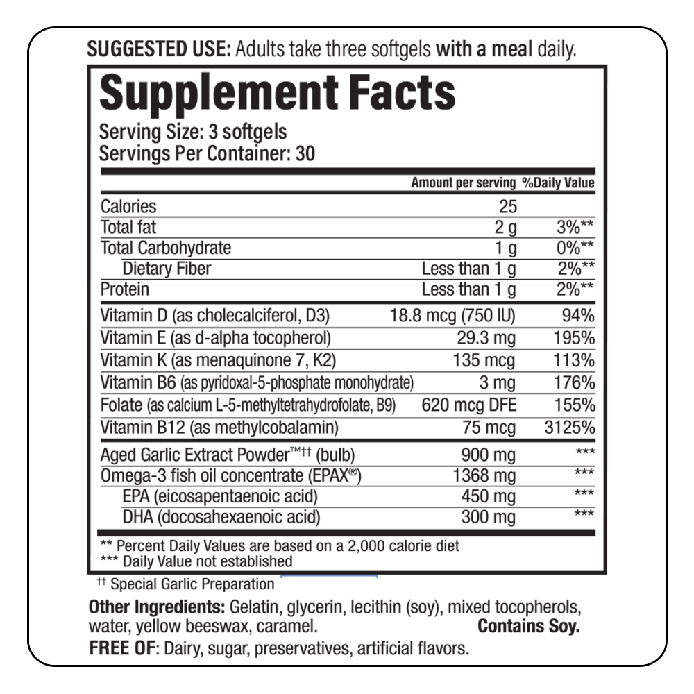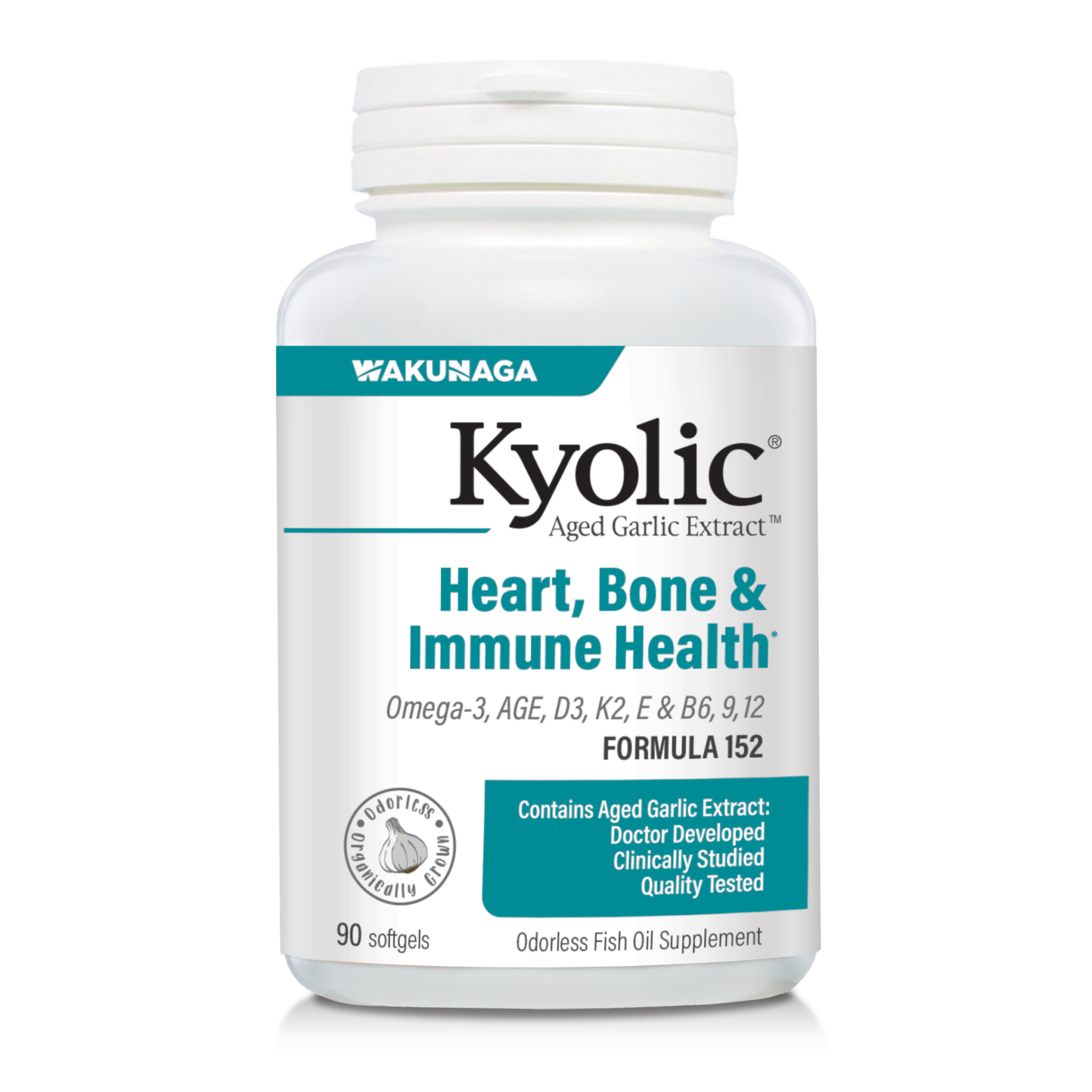 Kyolic® Formula 152 is a unique multi-system supplement that focuses on supporting optimal cardiovascular, skeletal, and immune health. A therapeutic dosage of Aged Garlic Extract is paired with EPAX® Omega 3s, an ultra-pure and sustainable source of omega-3s that are certified by Friend of the Sea® (FoS). Plus the unique combination of vitamins D3, K2, E, and B6 makes this formula a comprehensive way to support heart, bone and immune health in one supplement.