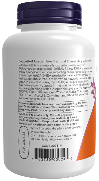 7-Keto-DHEA is a naturally occurring metabolite of dehydroepiandrosterone (DHEA). 7-Keto-DHEA is involved in many biological functions including cellular production of heat (thermogenesis).* DHEA production and 7-Keto-DHEA, as well as metabolic rate, are known to naturally decrease with age.* In clinical studies, 7-KETO®, a unique ingredient, has been shown to assist in the maintenance of a healthy body weight along with a proper diet and exercise regimen.* NOW® 7-KETO® LeanGels™ also includes CLA, Green Tea Extract, Acetyl-L-Carnitine, and Rhodiola extract as complements to 7-KETO®. 7-KETO® is a registered trademark of InterHealth Nutraceuticals Inc. Natural color variation may occur in this product.