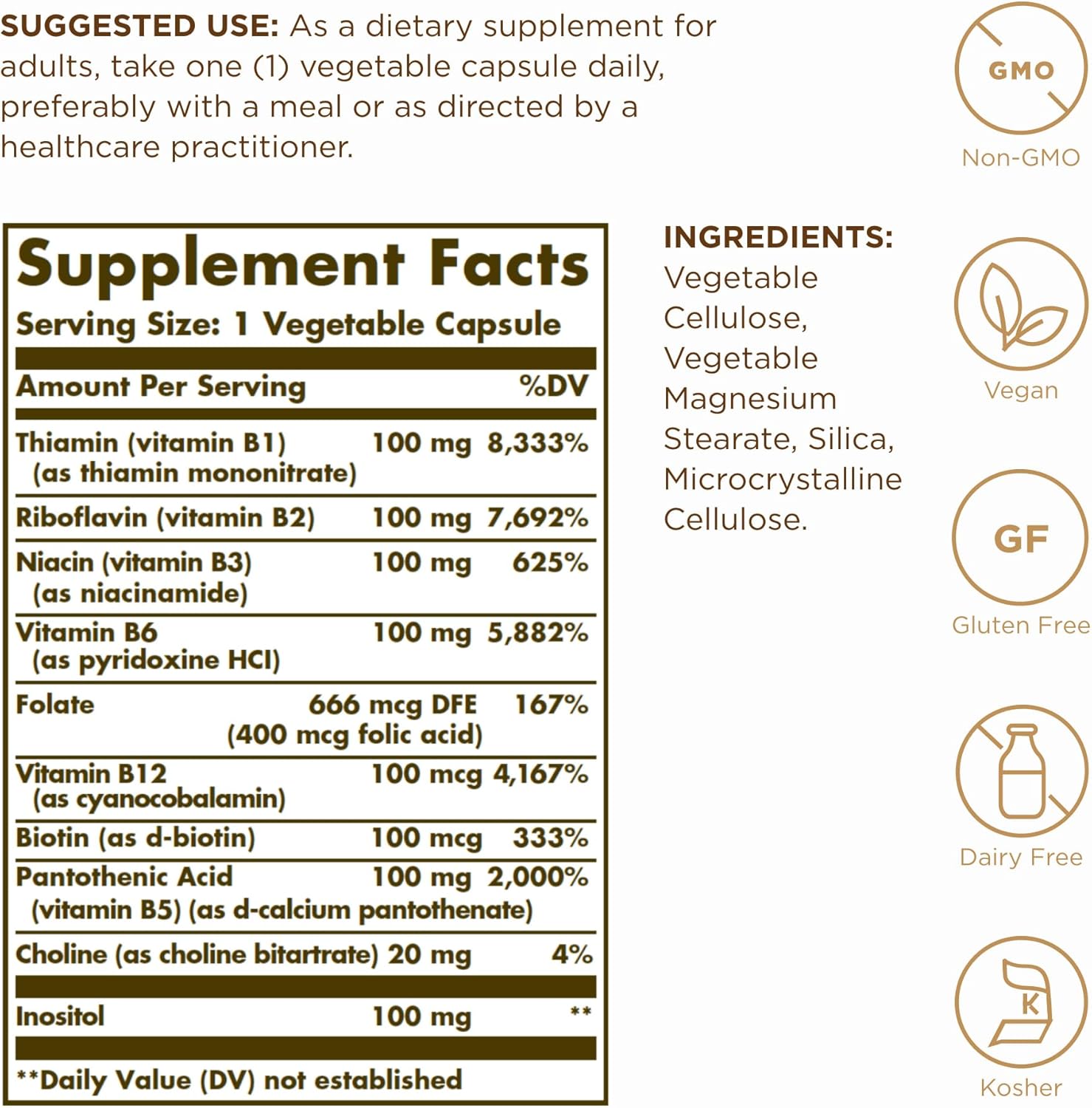 Each required nutrient in the Vitamin B Complex performs a unique role in maintaining proper metabolic functioning, while nutritionally supporting the body during the occasional stress of daily living. B Complex vitamins are needed for the metabolism of carbohydrates, fats and proteins, which converts food into energy. In addition, these vitamins play a necessary role in supporting cardiovascular and nervous system health.