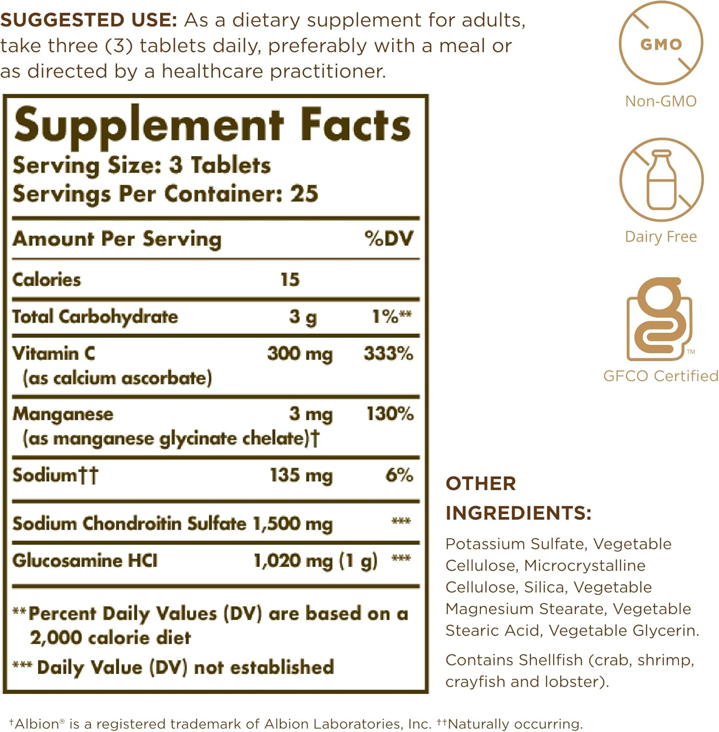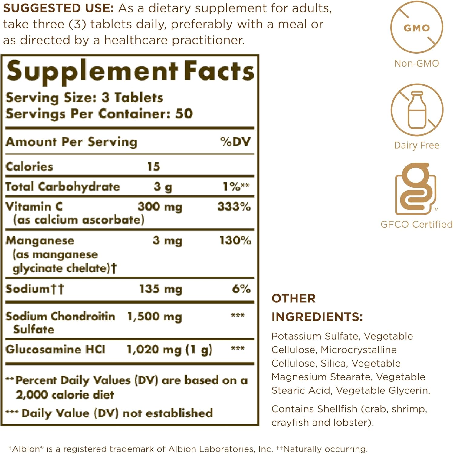 Glucosamine helps with joint health and nutritionally works to support the structural framework of healthy joints . Glucosamine and Chondroitin are important components of glycosaminoglycans the essential structural material in healthy cartilage. Chondroitin supports mobility and flexibility. Vitamin C is involved in the formation of collagen, which is a protein essential in the formation of tendons and ligaments Manganese plays a role in the production of healthy cartilage compounds.